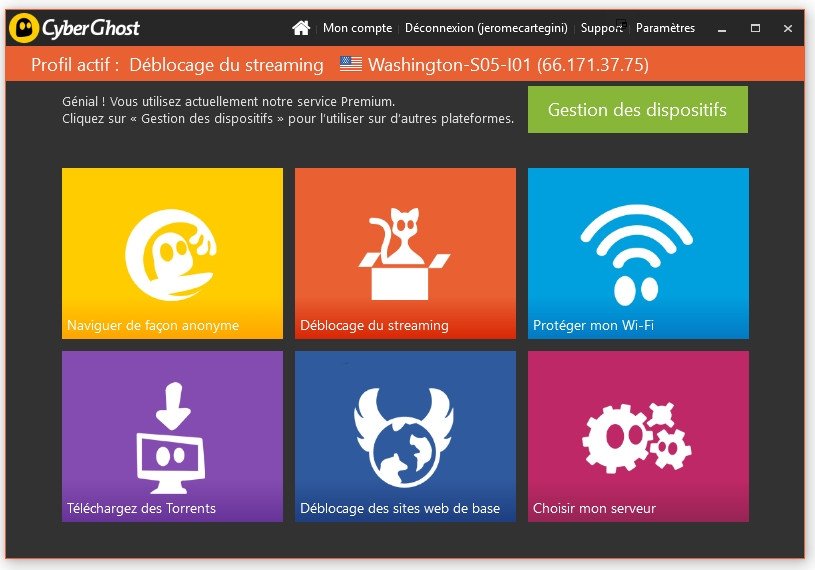 La solution se démarque d'emblée de toutes les autres par une interface fun et ultra moderne comprenant des tuiles pour accéder aux principales options : « Naviguer de façon anonyme », « Déblocage du streaming », « Protéger mon Wi-Fi », « Téléchargez des Torrents », etc. Un agencement réussi qui rend l'utilisation de ce service vraiment intuitive et agréable au quotidien.