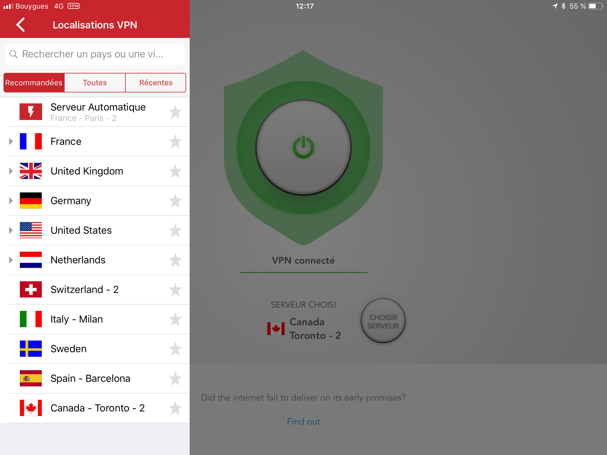 La qualité du service dépend de la localisation des serveurs. Contrairement aux serveurs basés en France qui fonctionnent bien, il est parfois difficile, voire impossible de se connecter à ceux basés aux États-Unis ou au Brésil, par exemple. La vitesse s'avère elle aussi assez inégale, et nettement moins rapide que certains fournisseurs tels qu'ExpressVPN ou Hotspot Shield.