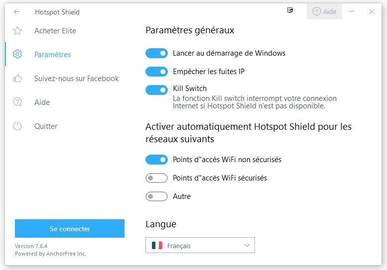 | HotspotShield | + Simplicité d'utilisation + Connexion stable et ultra rapide + Jusqu'à 5 connexions simultanées - P2P et torrents non autorisés - Peu d'options de réglages | Voir l'offre |