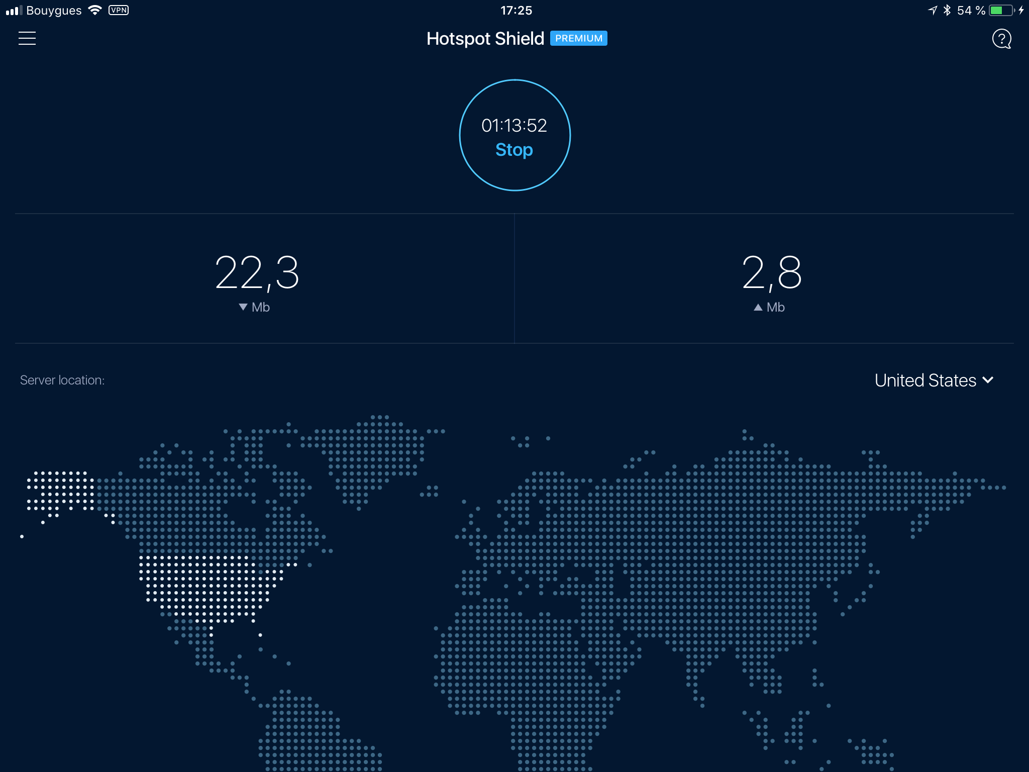Considéré comme le leader du marché du VPN avec plus de 500 millions d'utilisateurs à travers le monde, Hospot Shield joue dans la cour des grands. Peu de services VPN rivalisent avec celui-ci en termes de vitesse de connexion, quel que soit le serveur utilisé.