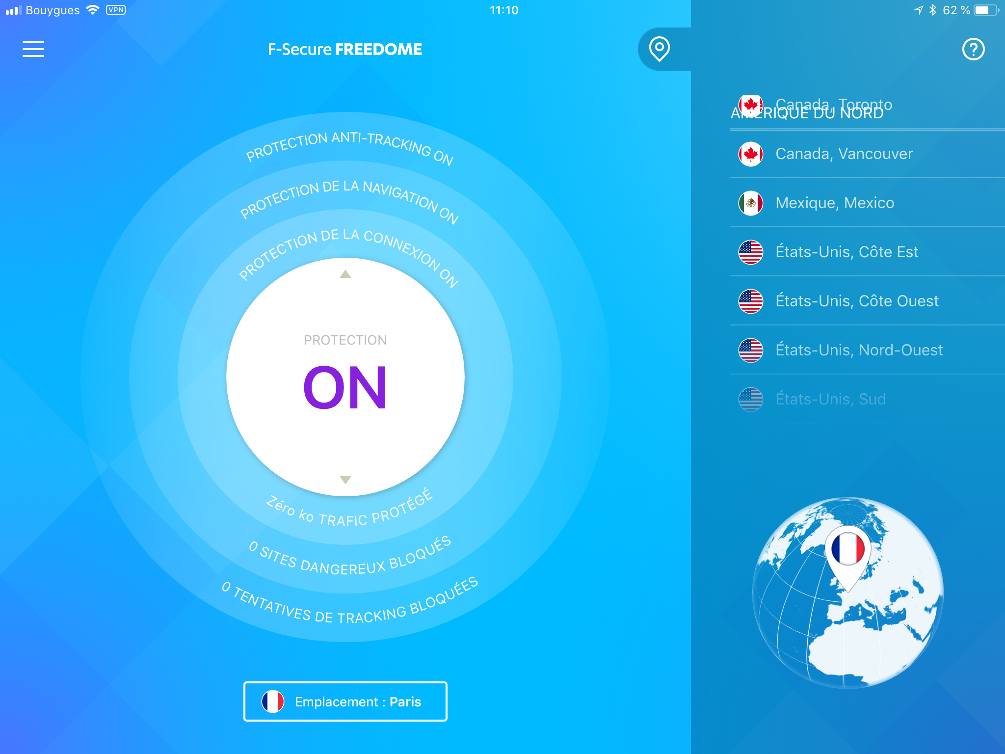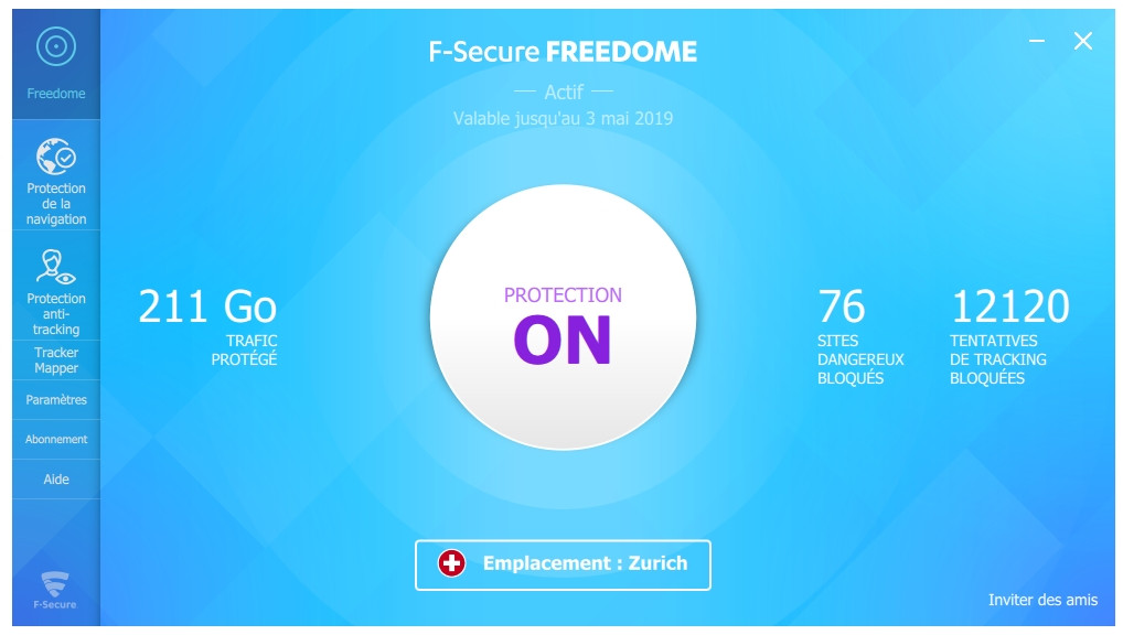 | F-Secure Freedome | + Interface soignée et simple + Statistiques des blocages + Pas besoin de compte - P2P et torrents non gérés - Paramétrages limités | Voir l'offre |