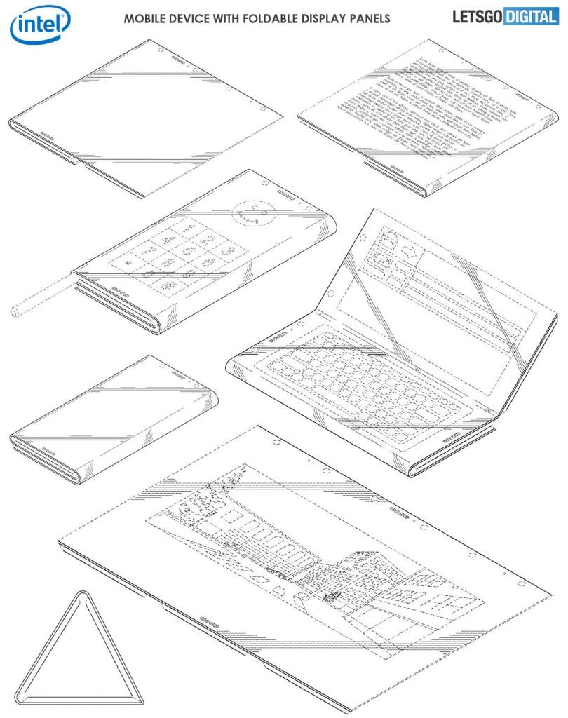 Repéré cette semaine par le site néerlandais Let's Go Digital, un brevet déposé par Intel sur la mi-2017 détaille les grandes lignes du projet, qui serait - avec le smartphone pliable dévoilé récemment par Xiaomi - l'un des premiers à adopter un système pliable en trois points. Comme décrit sur les croquis en provenance d'Intel, l'appareil est axé sur trois écrans rattachés entre eux par deux charnières. L'ensemble pourrait par conséquent être utilisé comme une tablette disposant d'un format carré, ou comme une ardoise pleine taille une fois totalement déplié.Plus intrigant, l'appareil imaginé par Intel pourrait être partiellement plié pour reprendre plus ou moins la forme d'un ordinateur portable. Son panneau supérieur servirait alors d'écran tandis que le reste du dispositif, replié sur lui-même, afficherait un clavier tactile miniature. Ce concept n'est d'ailleurs pas sans rappeler le Lenovo Yoga Book, qui profite lui aussi d'une partie clavier entièrement tactile enrichie d'un léger retour haptique.