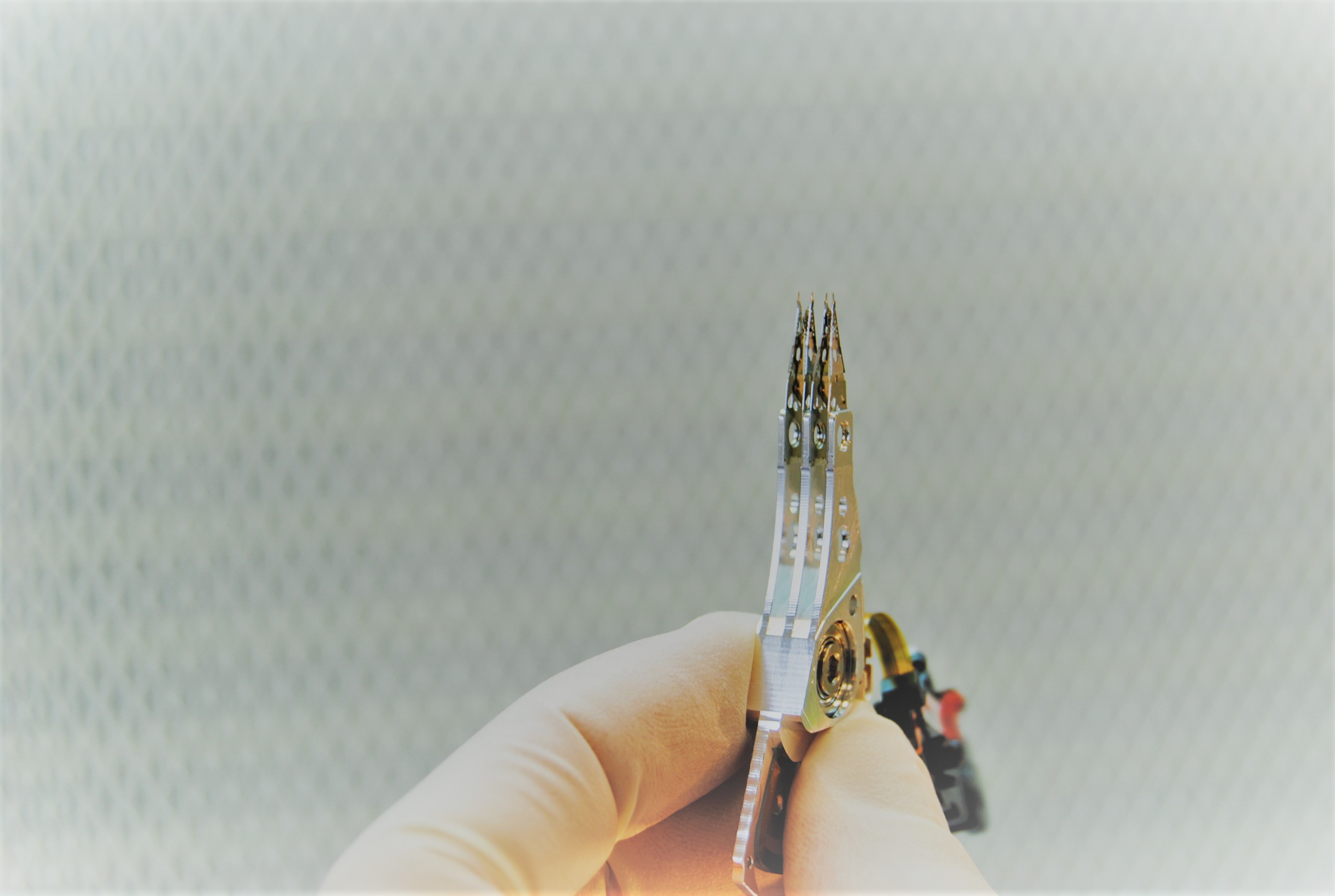 Puis les techniciens ont vérifié l'état de ces têtes de lecture et enregistré les paramètres afin de les appliquer à un nouveau bloc, issu d'un disque dur compatible avec le nôtre. Un nouveau bloc intégré au notre support, non sans avoir au préalable dépolluer et vérifier la surface des plateaux à la loupe.