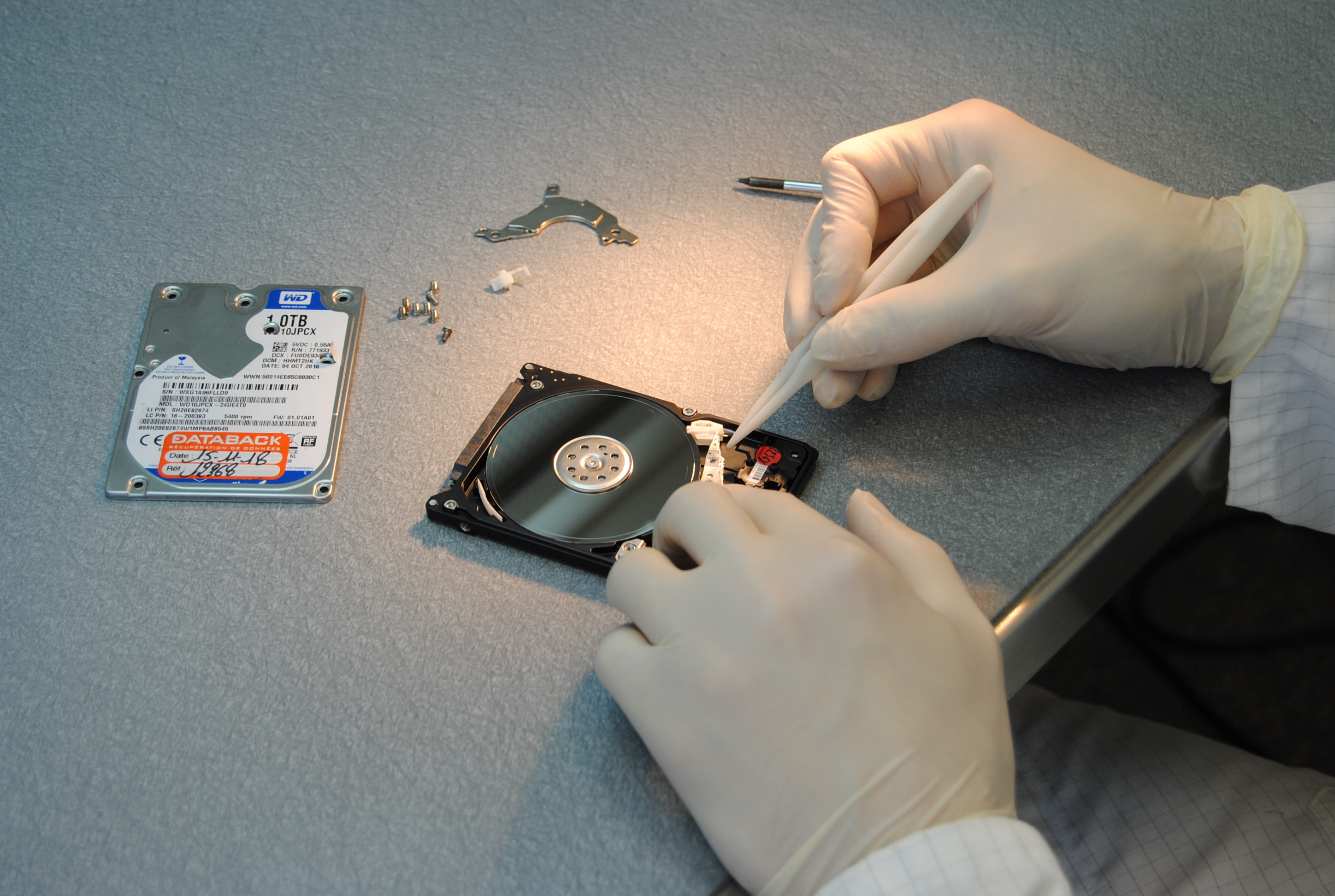 Quelles opérations ont donc pratiquées ces experts de la récupération de données sur notre disque ? Tout d'abord, ils ont opéré le diagnostic évoqué plus haut. Notre disque a ensuite été démonté en salle blanche, afin d'extraire le bloc de têtes de lecture défectueux.