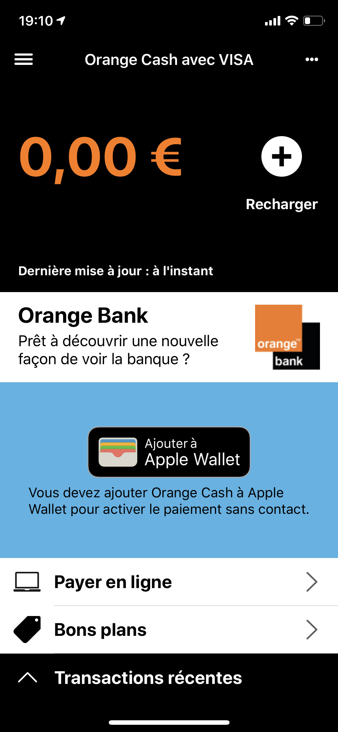 Réservée aux clients Orange ou Sosh, Orange Cash vous demande la création d'un compte dédié au service dès l'ouverture de l'application. Une affaire de quelques minutes, qui vous mène ensuite à l'écran principal du service.Si vous êtes utilisateur iOS, l'application vous proposera d'ajouter le service à Wallet. Cela est nécessaire au bon fonctionnement de l'application.