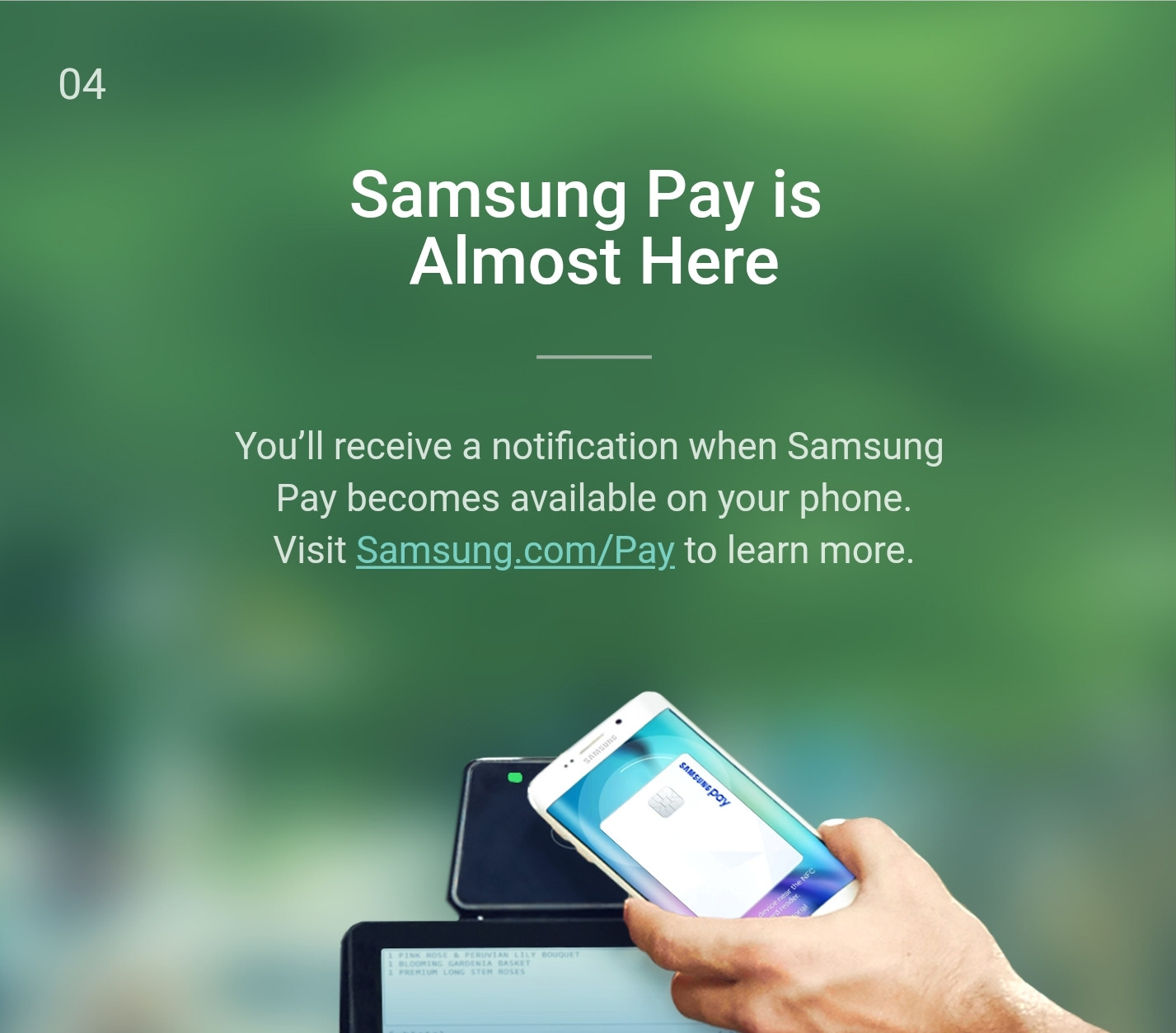Si vous disposez d'un smartphone compatible (Galaxy A5 et ultérieur, toute la gamme des Galaxy S à partir du S7), il vous suffit de vous procurer l'application Samsung Pay depuis le Google Play Store ou le Galaxy Apps. Lancez ensuite l'application et, si vous avez de la chance, vous pourrez procéder à l'enregistrement de votre ou vos cartes de paiement.Nous précisons "si vous avez de la chance", car notre Galaxy S8 n'affichait qu'une page d'accueil en anglais, annonçant « que le service sera bientôt disponible dans votre pays ».