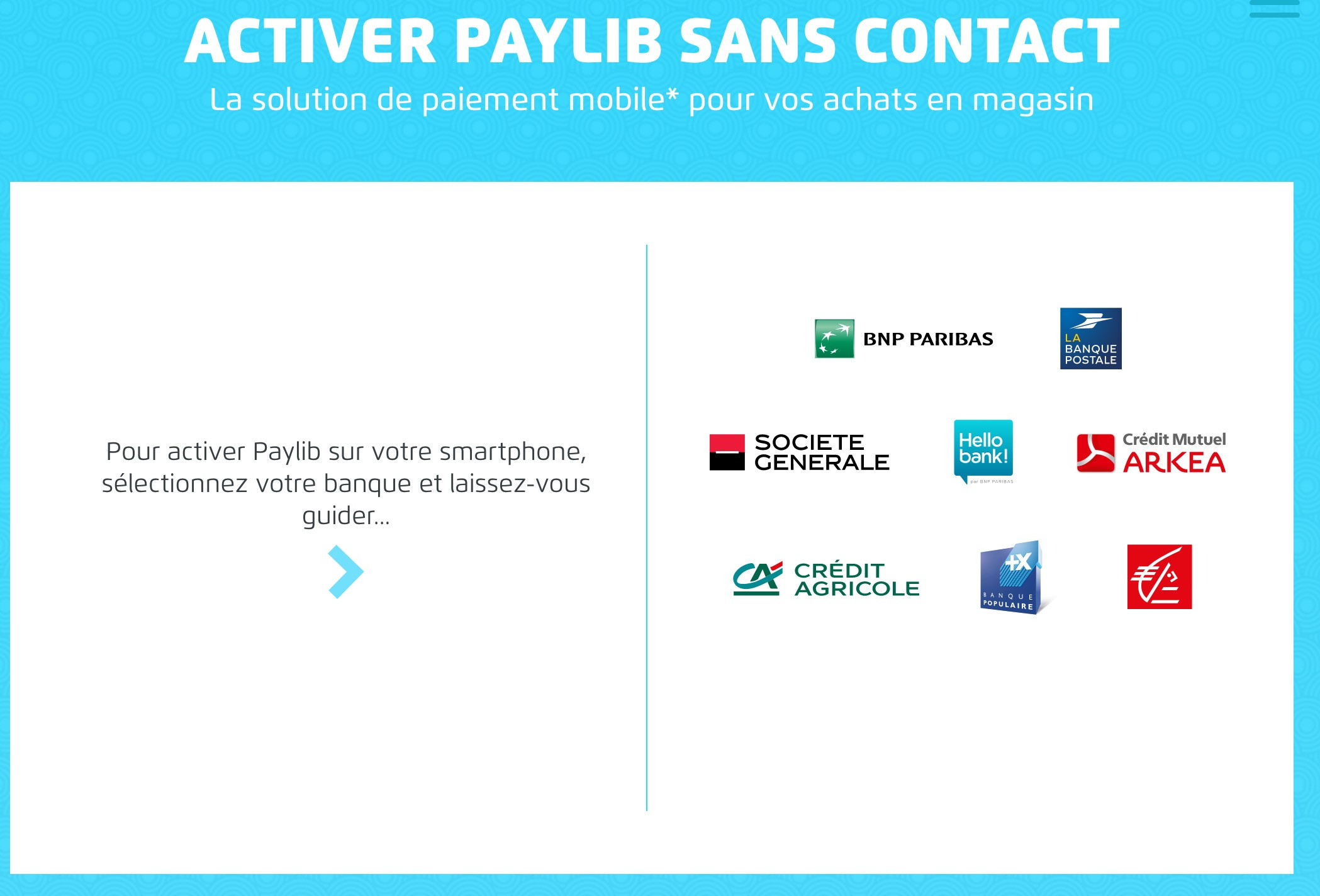 Paylib est actuellement proposé par les banques suivantes via leur application mobile : BNP Paribas, La Banque Postale, Société Générale, Hello Bank!, Boursorama Banque, Crédit Mutuel Arkea, Crédit Agricole, Banque Populaire, Caisse d'Épargne.Nous attirons néanmoins votre attention sur le fait que Boursorama est la seule banque de la liste ne proposant pas le paiement sans contact via Paylib. Seuls les achats via Internet sont supportés par la banque en ligne.