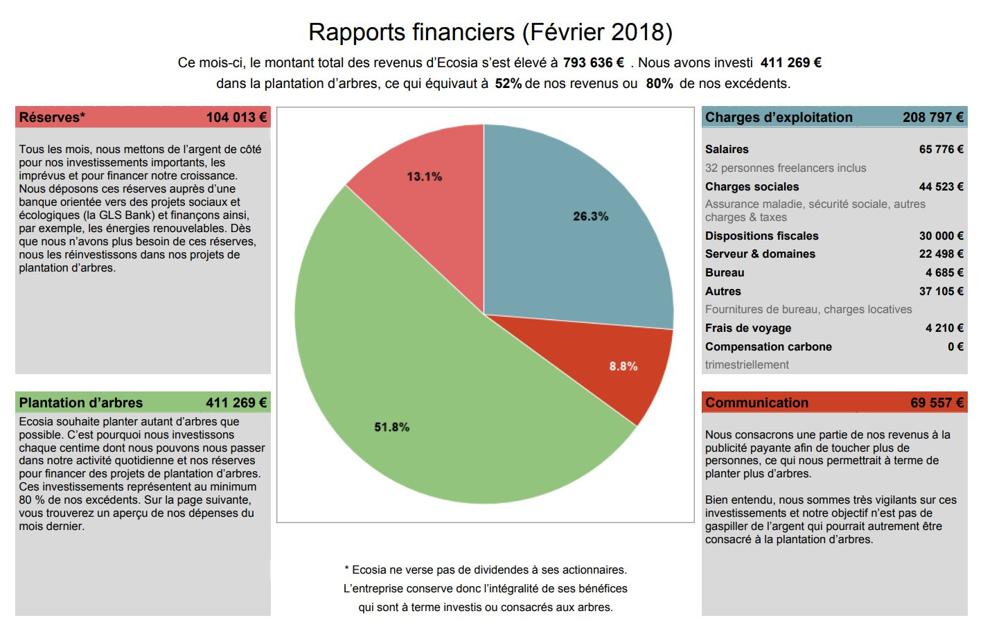 La jeune société allemande a pour objectif de reverser 80% de ses bénéfices - soit environ 50% de ses revenus - dans des projets de plantation d'arbres. Le moteur de recherche se finance grâce à la publicité mais aussi les dons. S'il peut sembler difficile qu'une entreprise puisse vivre de ce type de fonctionnement, Ecosia prouve le contraire en publiant chaque mois ses résultats financiers, consultables par tous les utilisateurs directement sur le site officiel.