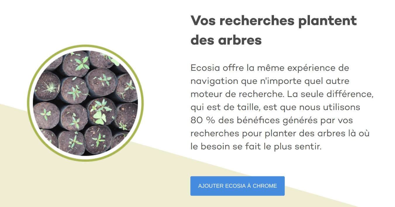 "Ecosia est un moteur de recherche soucieux du respect de la vie privée de ses utilisateurs. Nous prenons très au sérieux la protection de tes données personnelles.