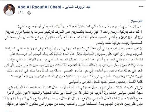 Pris dans la tempête, le député Abderraouf Chebbi s’est fendu d’une publication sur Facebook, samedi 17 août 2019, pour tenter de stopper les bruits autour de son double parrainage : Nabil Karoui et Slim Riahi, tous deux candidats à la présidentielle, rappelons-le.