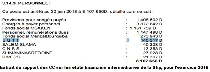 Enfin, il y a lieu de se poser la question, la STIP étant une entreprise cotée en bourse car faisant appel public à l’épargne, sur ces 140,5 mille DT versés par la STIP à… l’UGTT, ce qui correspondrait à un montant mensuel de plus de 23 mille DT. S’agirait-il du montant des cotisations des employés de la STIP auprès de l’UGTT ou autre chose ?         Dans les états financiers intermédiaires, en tout cas, aucune explication officielle n’est donnée à cette somme de 140 mille DT, versée au nom de l’UGTT et qui n’existait pas dans les états financiers au 31 décembre 2017 !